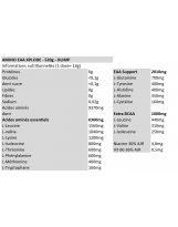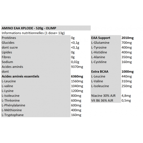 Mélange d’acides aminés essentiels : l-leucine, l-lysine, l-valine, l-isoleucine, l-thréonine, l-phénylalanine, l-méthionine, l-tryptophane. EAA Support : l-glutamine, l-tyrosine, l-histidine HCl, l-alanine, cystine. Extra BCAA : l-leucine, l-isoleucine, l-valine. Niacine (nicotinamide), vitamine B6 (Pyridoxine hydrochloride), épaississant (gomme d’accacia), régulateurs d’acidité (acide malique, acide citrique, citrate de sodium), édulcorants (acésulfame K, sucralose).