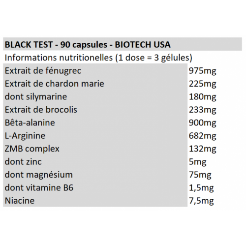Aussi, Black Test contient du ZMA, un mélange de Zinc, magnésium et vitamine B6, qui va booster la sécrétion de testostérone et d’hormone de croissance.