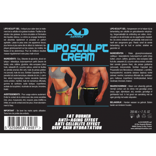 Lipo Sculpt Cream Addict Sport Nutrition est une crème minceur / brûleur de graisse. Ce gel peut traiter la cellulite et les graisses localisées tout en facilitant la micro-circulation et l’élimination des liquides retenus. Lipo sculpt Addict Sport Nutrition est très efficace en période sèche et perte de poids !