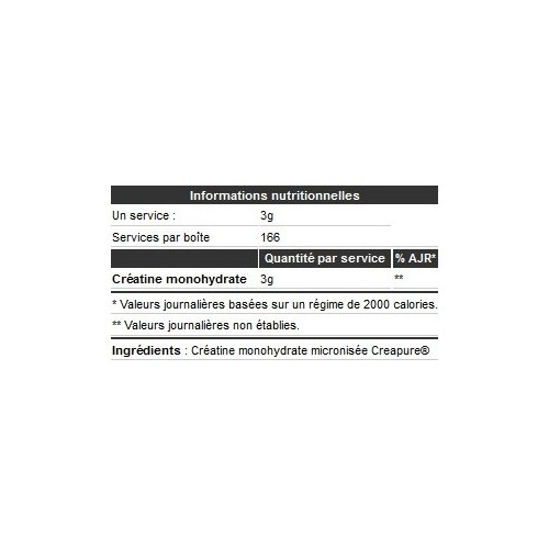 Créatine monohydrate Creapure® est une forme micronisée de créatine qui a une meilleure solubilité et absorption par les tissus que la créatine monohydrate traditionnelle.