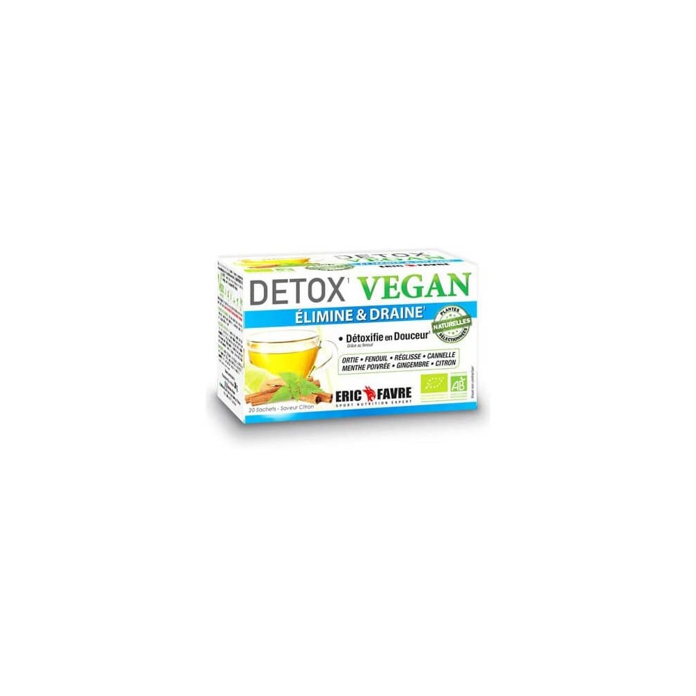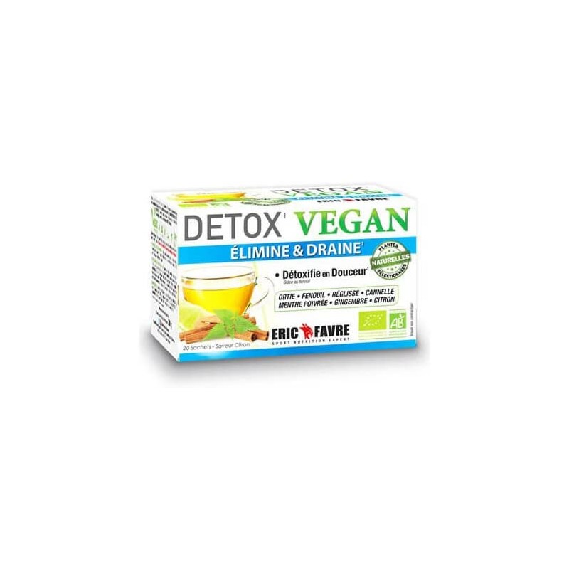Detox Vegan est un produit sous forme de tisane 100% nature qui permet de détoxifier et purifier en douceur l’organisme tout en facilitant l’élimination des graisses. Ce produit a été fabriqué par la célèbre marque de nutrition sportive Eric Favre. En effet, Detox Vegan est une tisane 100% nature à boire tout au long de la journée et qui a été formulée à partir d’une grande diversité de plantes certifiées Agriculture Biologique, qui font de ce complexe, un puissant détoxifiant et draineur 100% vegan qui activera la fonte et l’élimination des graisses stockées dans votre organisme.